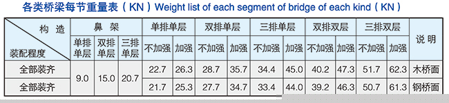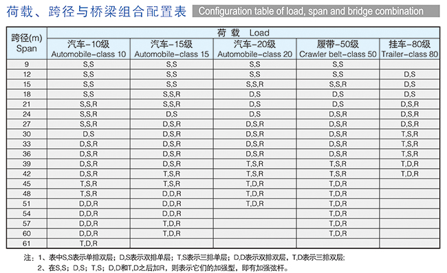 “321”型裝配式鋼橋適用范圍:?jiǎn)诬嚨?橋面凈寬:3.7m 組合跨徑-:9-75m